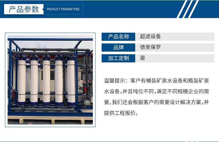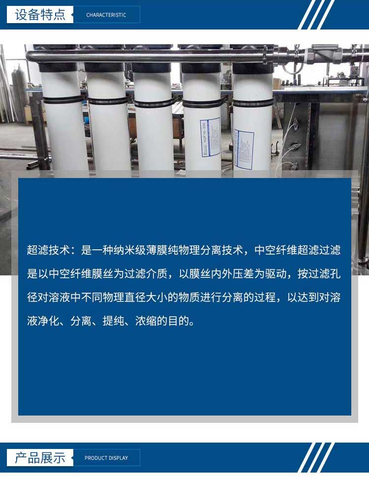 在超滤过程中,水溶液在压力推动下,流经膜表面,小于膜孔的溶剂(水)及小分子溶质透水膜,成为净化液(滤清液),比膜孔大的溶质及溶质集团被截留,随水流排出,成为浓缩液。超滤过程为动态过滤,分离是在流动状态下完成的。溶质仅在膜表面有限沉积,超滤速率衰减到一定程度而趋于平衡,且通过清洗可以恢复。超滤是一种加压膜分离技术,即在一定的压力下,使小分子溶质和溶剂穿过一定孔径的特制的薄膜,而使大分子溶质不能透过,留在膜的一边,从而使大分子物质得到了部分的纯化。超滤是以压力为推动力的膜分离技术之一。以大分子与小分子分离为目的 。